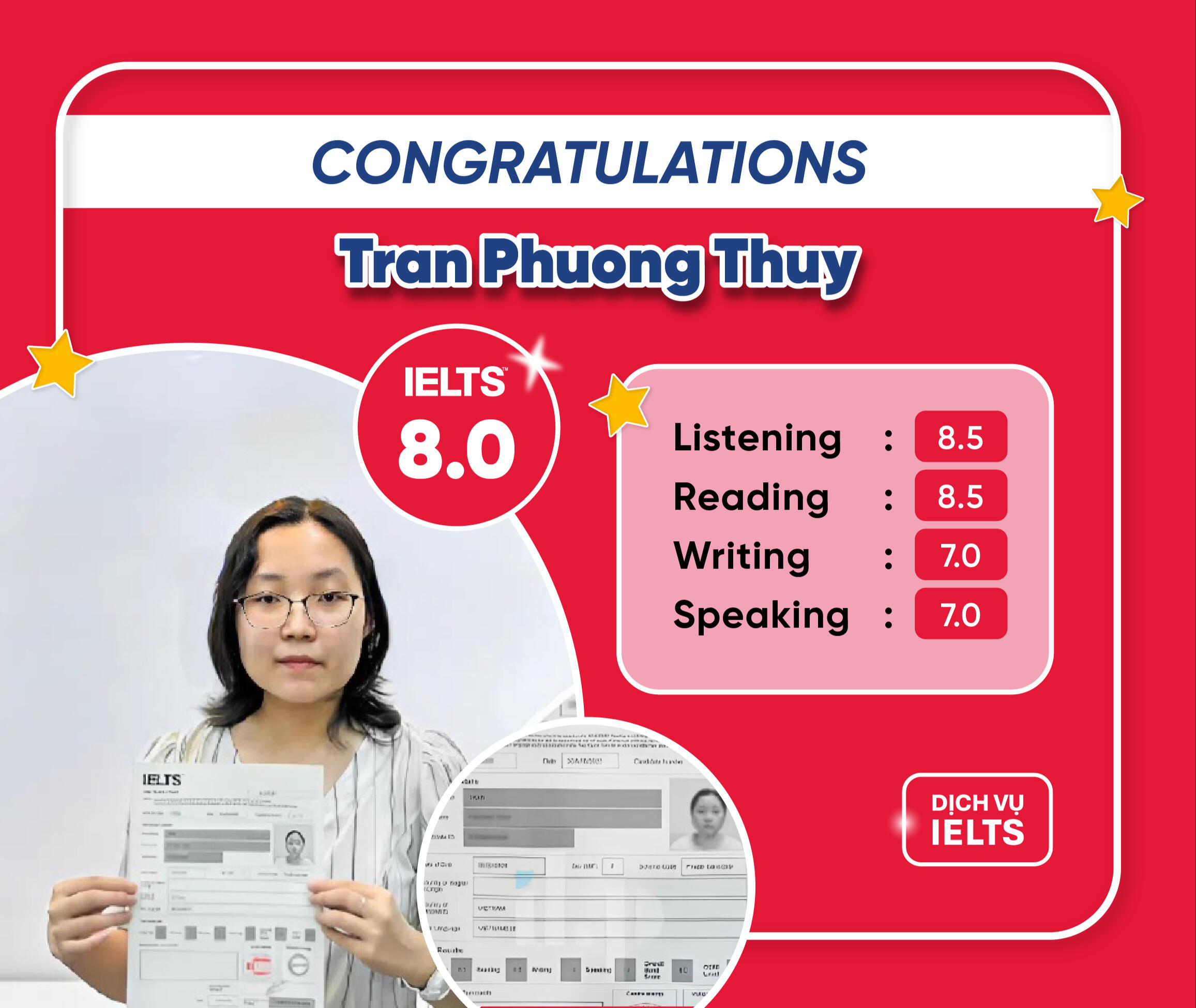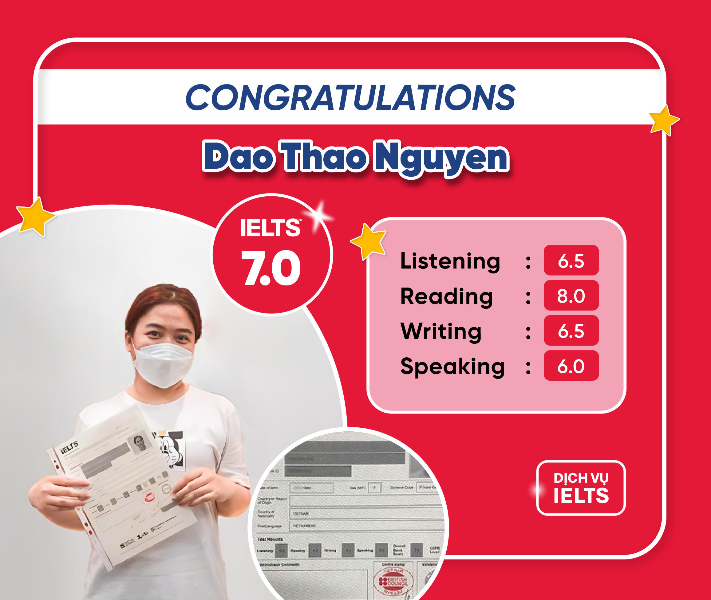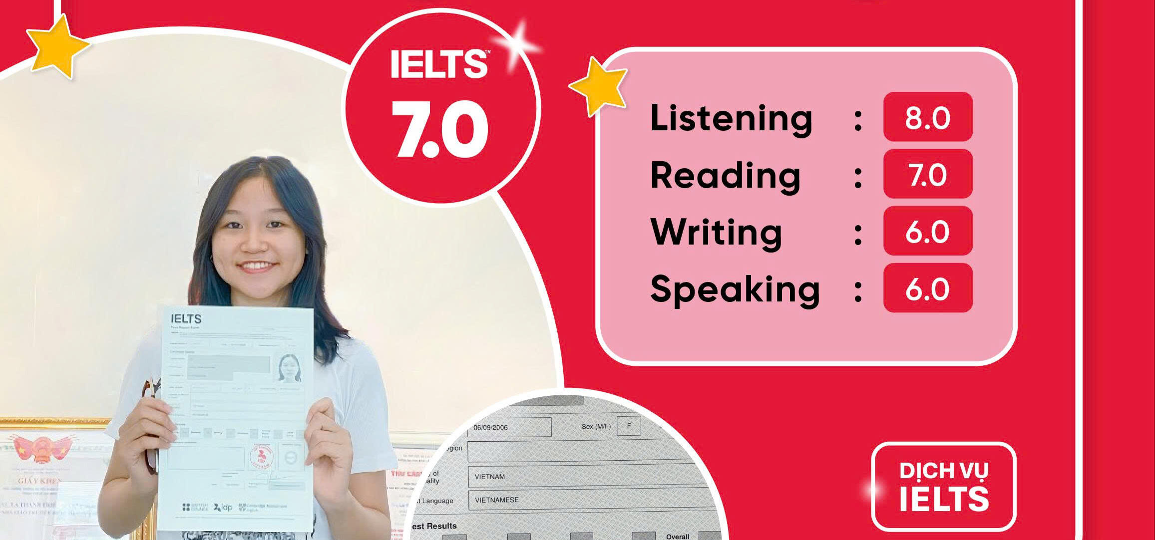 Hàng trăm học sinh - sinh viên của DỊCH VỤ IELTS đã đạt điểm IELTS 5.0-7.0 vào đại học, tốt nghiệp, du học và định cư.