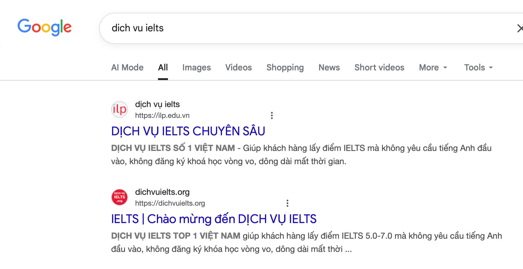 Chúng tôi không cần quảng cáo, chúng tôi không cần xây dựng thương hiệu, chúng tôi không phải cơ sở đào tạo truyền thống đang hoạt động theo mô hình đào tạo ngoại ngữ lỗi thời. Tại Việt Nam, chúng tôi chính là DỊCH VỤ IELTS. Với từ khoá "dich vu ielts" hoặc hastag #dichvuielts, chúng tôi giữ vị trí TOP 1 trên Internet.